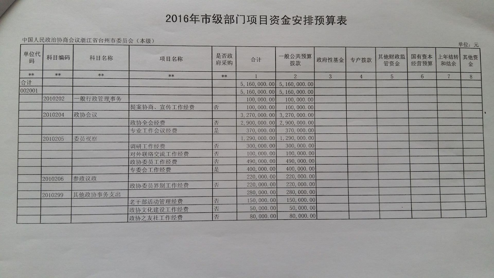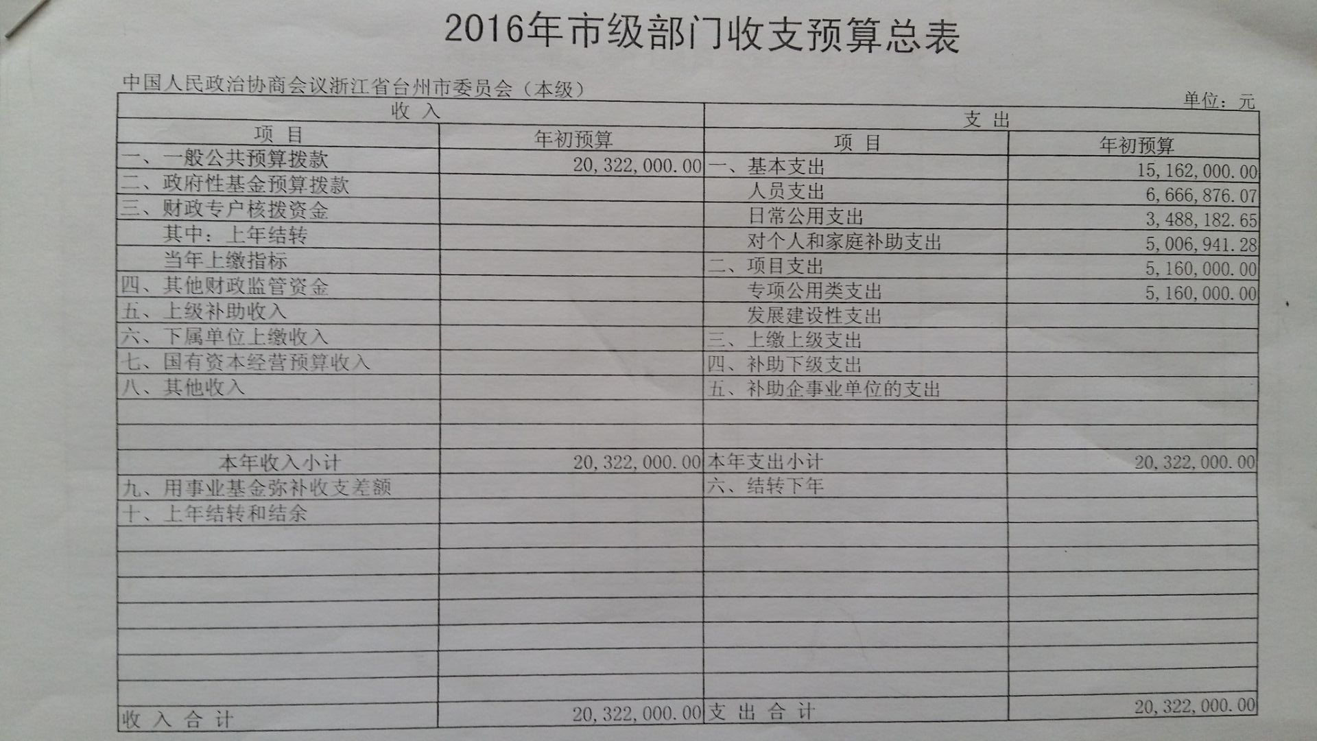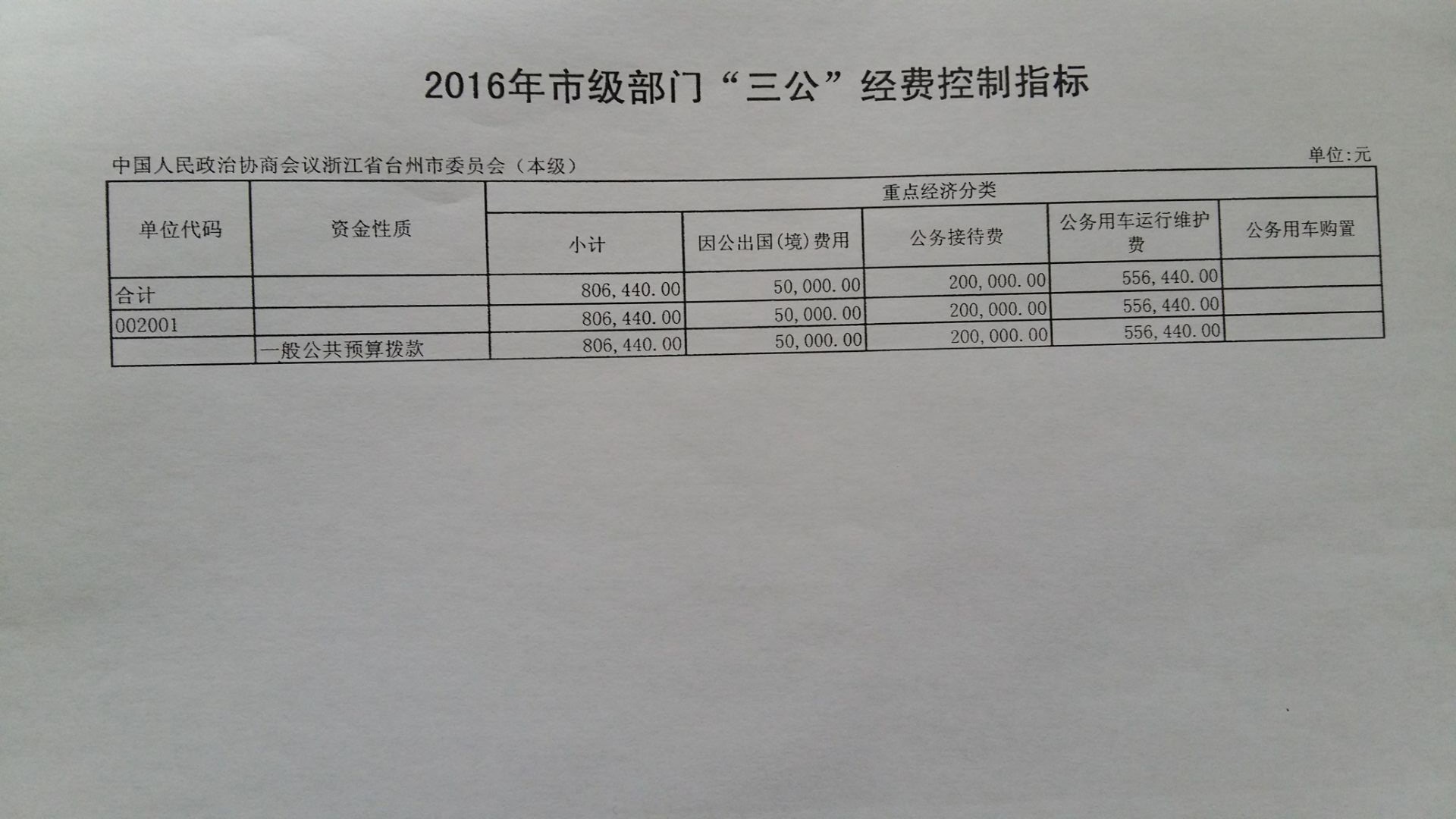 台州市政协2016年预算公开