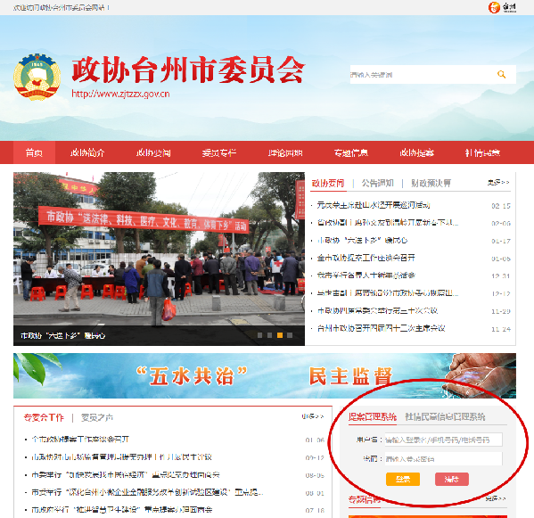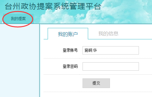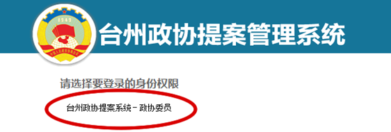 一、登录提案管理系统 打开台州政协网(网址:www.krohne-ln.com),在首页中部的【提案管理系统】登录区块,输入用户名和密码,点击【登录】按钮进入提案管理系统。(如下图) 二、选择登录身份 准确输入用户名和密码并点击登录后,将成功登录到提案管理系统的身份权限界面,选择并点击【台州政协提案系统—政协委员】进入操作界面。(如下图)