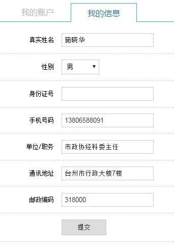 四、完善个人信息 点击当前页面的【我的信息】选项,进入个人信息界面,准确填写个人信息,点击【提交】按钮完成。(如下图)